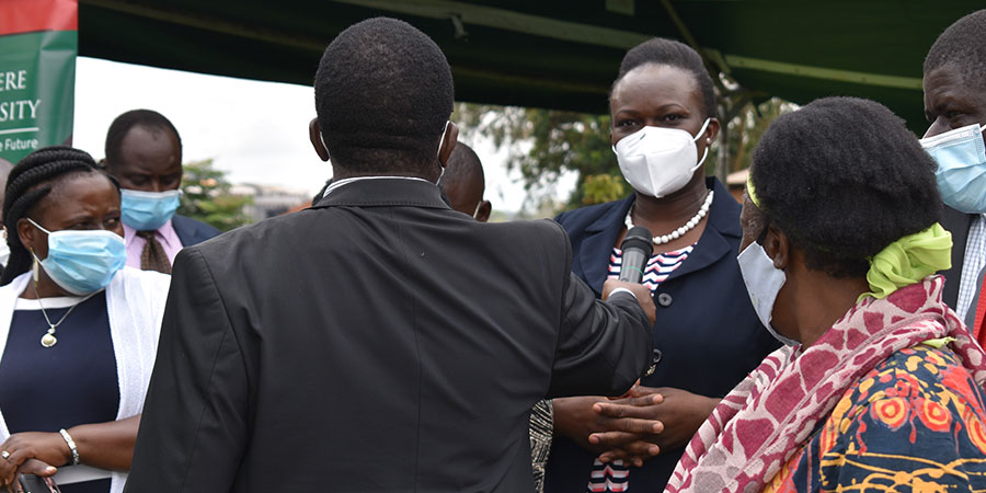 - The former President of the Uganda Veterinary Association, Dr. Sylvia Baluka making her comment on veterinary leadership as Prof. Kabasa holds the microphone during the UVA-AGM on 31st March 2021 in the Ruth Keesling Gardens.